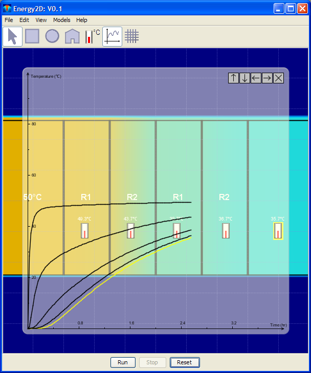 Instruction: Click inside a simulation window. Press ‘R’ to  start or stop, ‘T’ to reset, ‘L’ to reload the initial configurations, and ‘G’ to open or close a graph. The virtual temperature sensors can be moved around, though most other pieces are locked to their positions. Right-click on the windows for more actions.