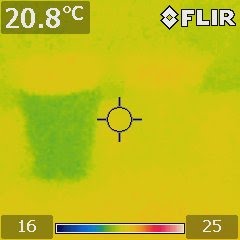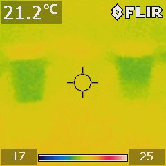 Now, we have to explain why the pure water cup shows a cool infrared signature. So I added a sealed pure water cup. The thermogram to the right shows that the sealed pure water cup vanishes in the infrared image (the sealed water cup is on the right of the thermogram), whereas the open pure water cup shows a cooler image for the part filled with water. Interestingly enough, the upper part of the cup that does not have water contact is constantly almost 1°C warmer than the filled part. This temperature gradient is clearly shown in the infrared image below. Why is the temperature gradient across the water line on the surface of the plastic cup so sharp?