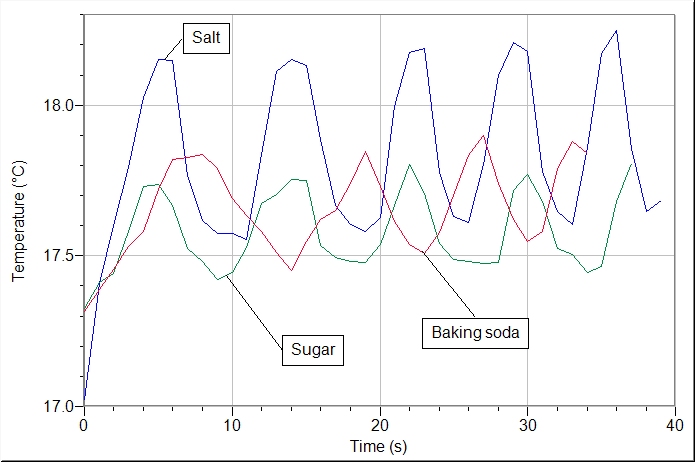 Now go back to the evaporative updraft force. At this point, we only know that cutting off evaporation shuts down the energy loop. We still do not know how what happens under the water line in the salt water cup. The following graph clearly shows that this effect exists in not only a salt solution, but also a baking soda solution and a sugar solution.