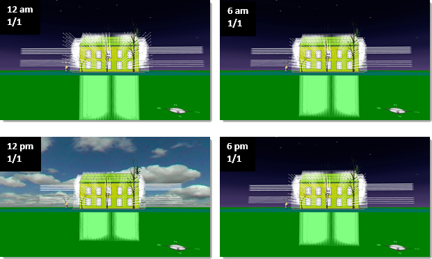 Figure 4 shows four snapshots of the heat transfer between a house and the ground at four different times (12 am, 6 am, 12 pm, and 6 pm) on January 1. The figure shows arrays of heat flux vectors that represent the direction and magnitude of heat flow. To exaggerate the visualization, the R-values of the floor insulation and the windows were deliberately set to be low. If you observe carefully, you will find that the change in the magnitude of the heat flux vectors into the ground lags behind that of those into the air.
