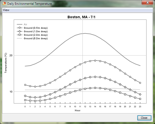 Exactly how the math works can be found in the User Guide. In this blog post, I will show you some results. Figure 1 shows the daily averages of the air and ground temperatures throughout the year in Boston, MA. There are two notable features of this graph: 1) Going more deeply, the temperature fluctuation decreases and eventually diminishes at six meters; and 2) the peaks of the ground temperatures lag behind that of the air temperature, due to the heat capacity of the ground (the ground absorbs a lot of thermal energy in the summer and slowly releases them as the air cools in the fall).