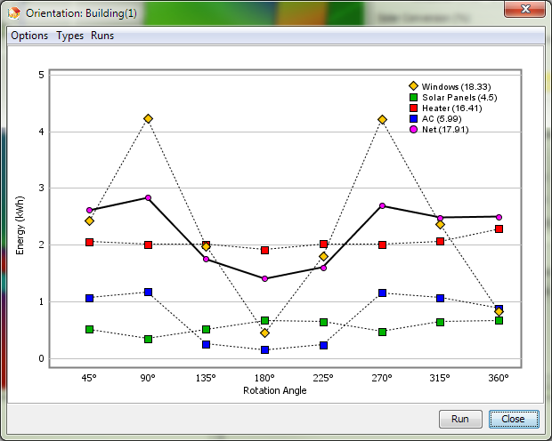 3) Building orientation optimization. Students can rotate a building and explore how energy can be saved by simply choosing an optimal orientation.