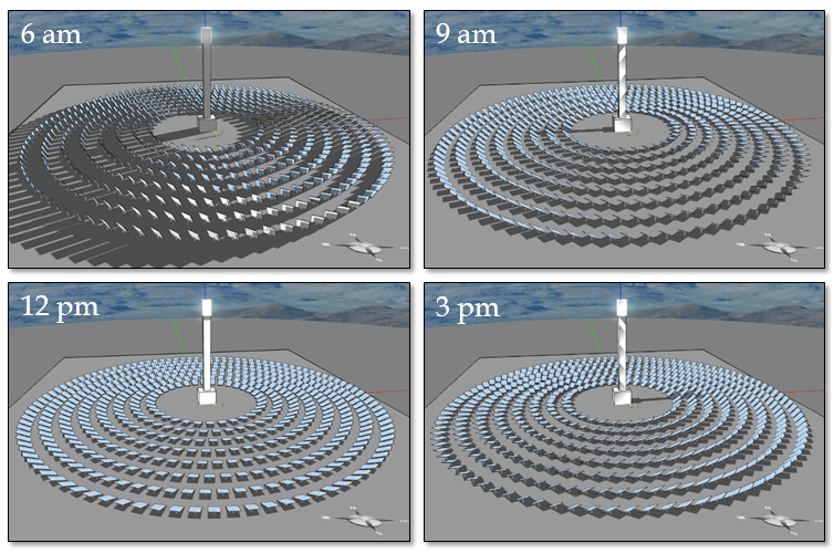 To support the exploration of all kinds of solar energy exploitation, we have added the initial capacity to model CSP power stations in our Energy3D software, which is intended to be a “one-stop-shop” for solar energy modeling and design. This includes the capability of adding mirrors, heliostats, and power towers and analyzing the outputs as a function of time, location, and weather. This article shows some of the graphic effects of solar power towers (with more than 500 reflectors, each of which has the size of 2 by 3 meters, amounting to a total reflective area of more than 3,000 square meters). The four images above demonstrate how heliostats change the orientations of the reflectors at different times of the day (the selected date is June 22 and the selected location is Phoenix, AZ). The images show a simple circular field layout. In reality, radial stagger layouts that minimize shadow loss and block loss and maximize cosine efficiency are commonly used.