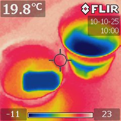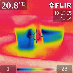 | Figure 3. An IR image taken after nine minutes showing the cooling effect at the bottom as indicated by the greenish halo. |