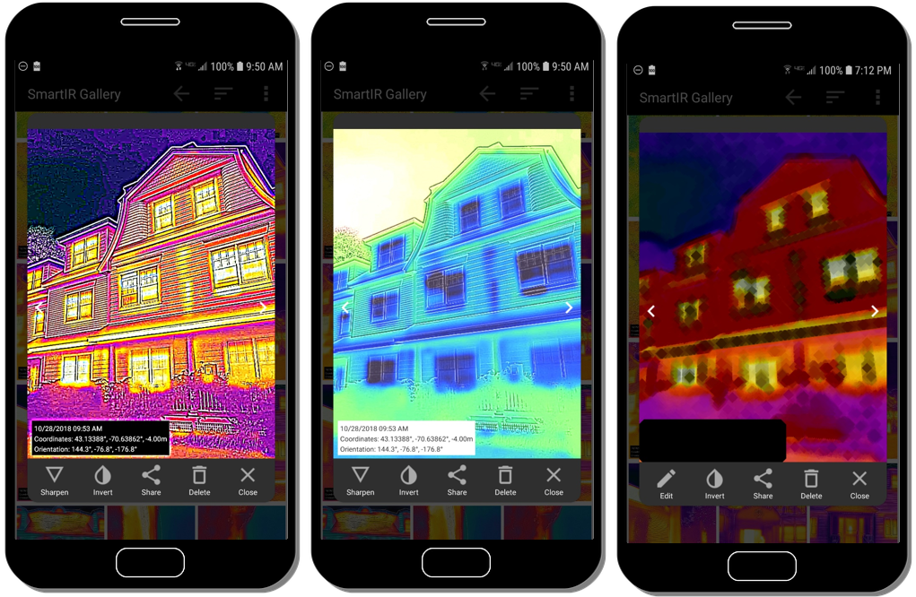 Based on OpenCV, SmartIR Gallery provides a number of image analysis tools for the user to quickly process thermal images. For instance, the user can blur, sharpen, invert, posterize, and adjust the brightness and contrast of an image (Figure 2). In the left image shown in Figure 2, sharpening a thermal image makes the view of the house more pronounced than the default view rendered by the FLIR ONE thermal camera. Inverting the thermal image, as shown in the middle image of Figure 2, may be a quick way to show how a heated house in the winter might look like in the opposite thermal condition such as an air-conditioned house in a hot summer day. In the right image shown in Figure 2, posterizing the thermal image creates an artistic view. More OpenCV tools will be added in the future to extend SmartIR’s thermal vision capacity.