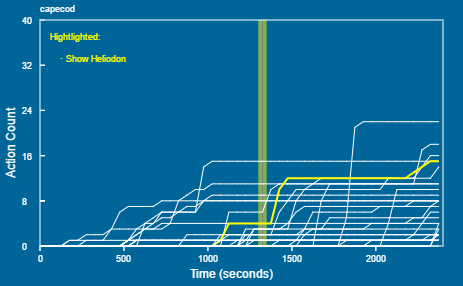 3) Cumulative data graphs are available to render a more dramatic view of time series. It is sometimes easier to spot patterns and trends in cumulative graphs. This cumulative analysis applies to all levels of granularity of data supported by VPA (currently, the three granular levels are Top, Medium, and Fine, corresponding to three different ways to categorize action data). VPA also provides a way for users to select variables from a list to be highlighted in cumulative graphs.
