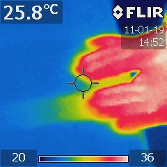 Lay a piece of aluminum on a foamcore board. Then cover it up with a piece of paper. Put one hand on top of the part of paper above the metal and the other on top of a part of paper that is not above the metal. Have your partner look at the hands on the plate through an IR camera. The reason that we want to cover the metal up with a piece of paper is because we want to make sure that the difference of temperature we observe has nothing to do with the difference of emissivity–the ability of a substance to emit infrared light–between metal and the base material.